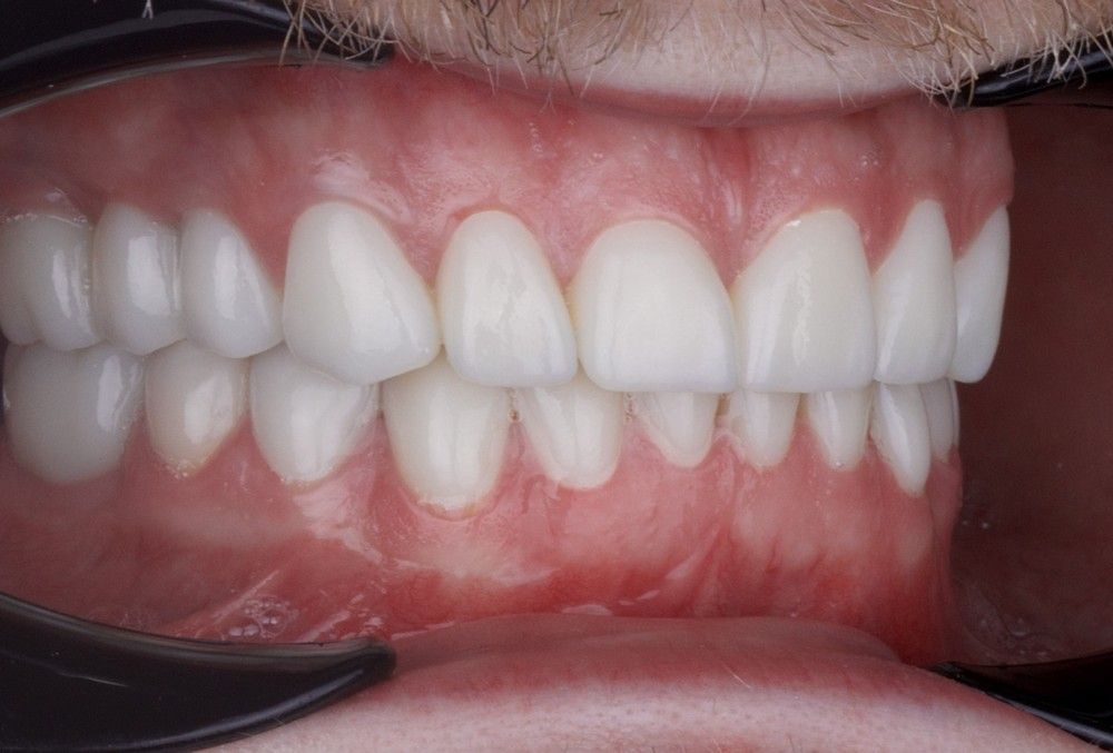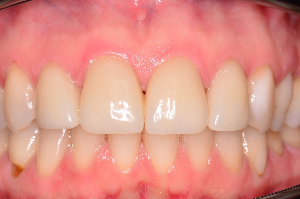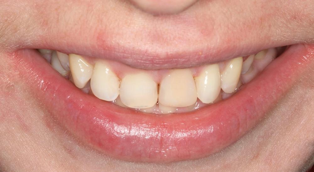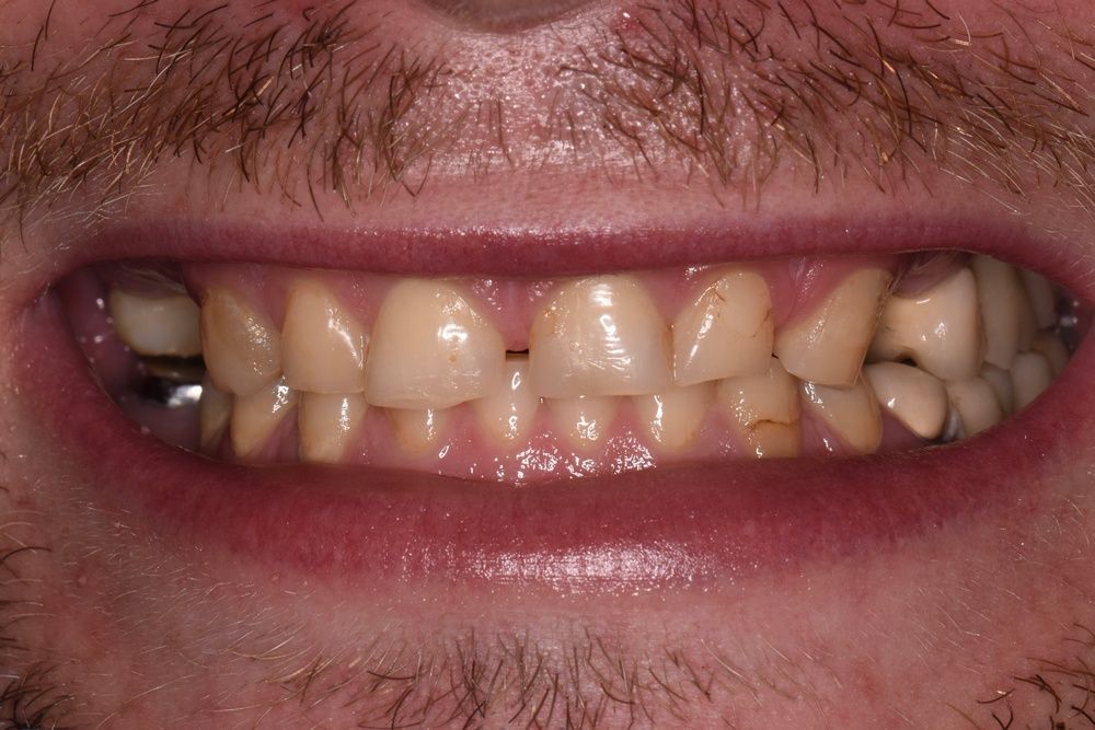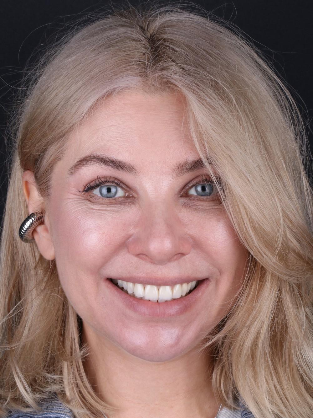 Жалобы: на отсутствие зубов, стираемость и чувствительность зубов, ночное скрежетание зубами, неудовлетворительная эстетика и промежуток между центральными резцами, сколы коронок на имплантатах.